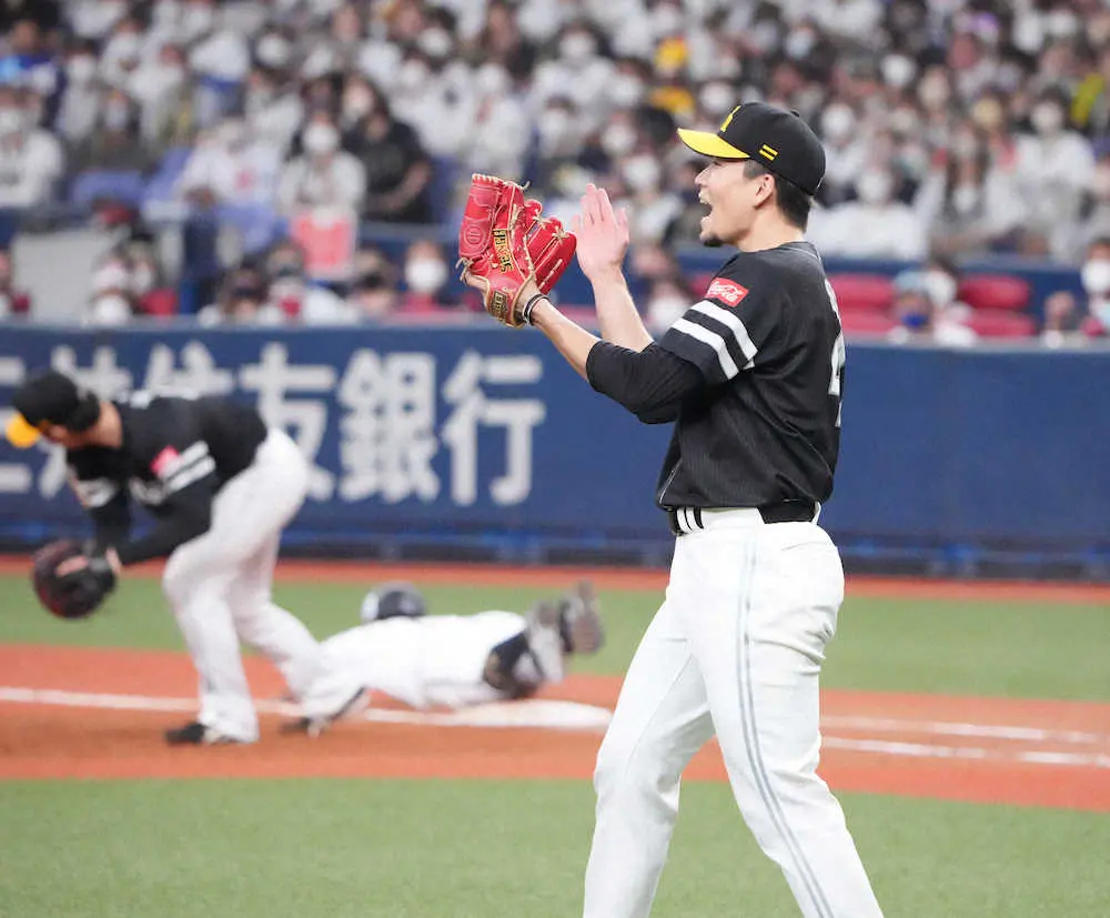3回の守備。紅林のライナーを二塁手・三森がダイビングキャッチ。続く福田の二遊間のゴロも三森がさばき、ジャンピングスローでアウトに。右腕は三度、グラブを叩いた。6回2死一塁は宗に右前打を許すも、右翼・柳田が三塁へレーザービームで補殺。流れは絶対に渡さない。