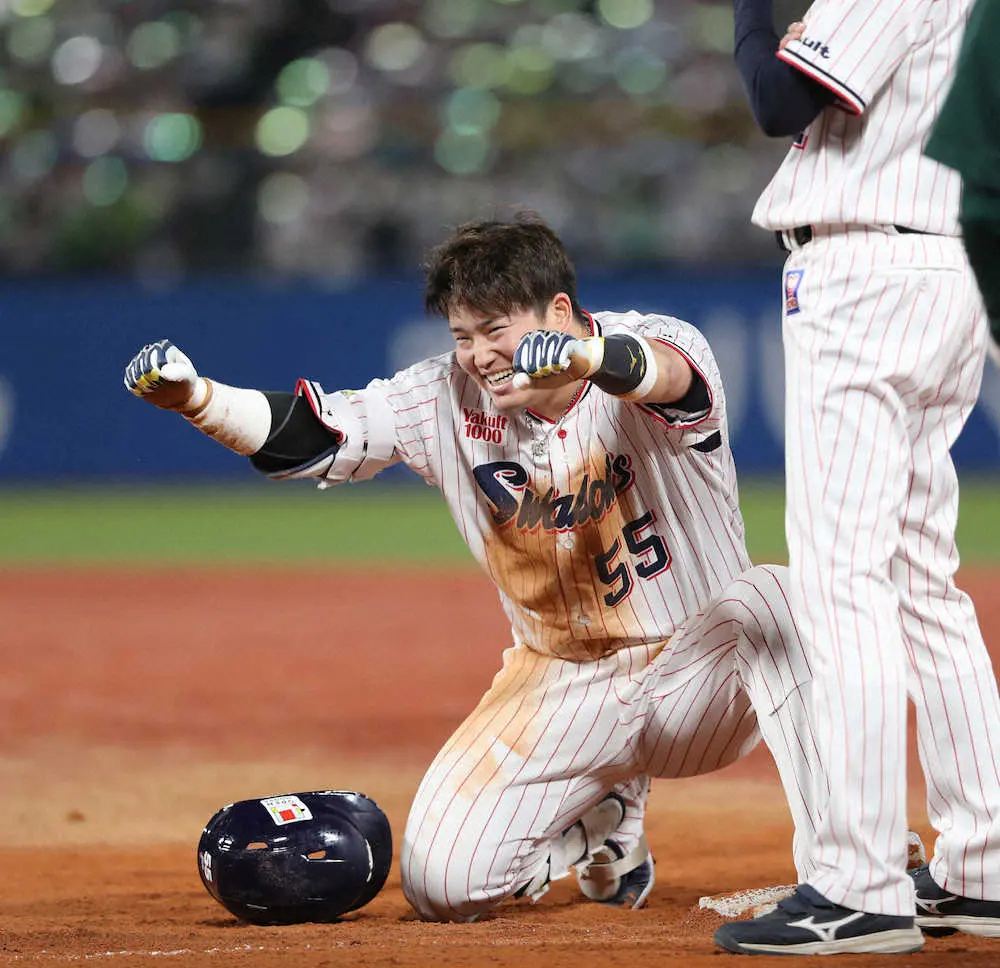 リーグ優勝に向けて歩を進めていた昨季終盤。10月5日の巨人との天王山でも気迫のヘッドスライディングで先制点をもぎ取り流れを引き寄せた。打撃だけでなく激走もチームを乗せる。高津監督も「ムネが素晴らしい当たりを最後に打ってくれた」と笑いつつ「持ってる男ですね。素晴らしいヘッドスライディング」と評価する。