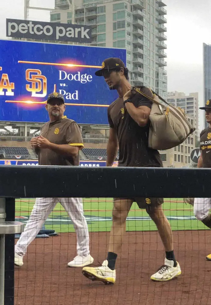地区シリーズ第4戦前、雨脚が強まり試合前練習から引き上げるダルビッシュ(撮影・柳原 直之)