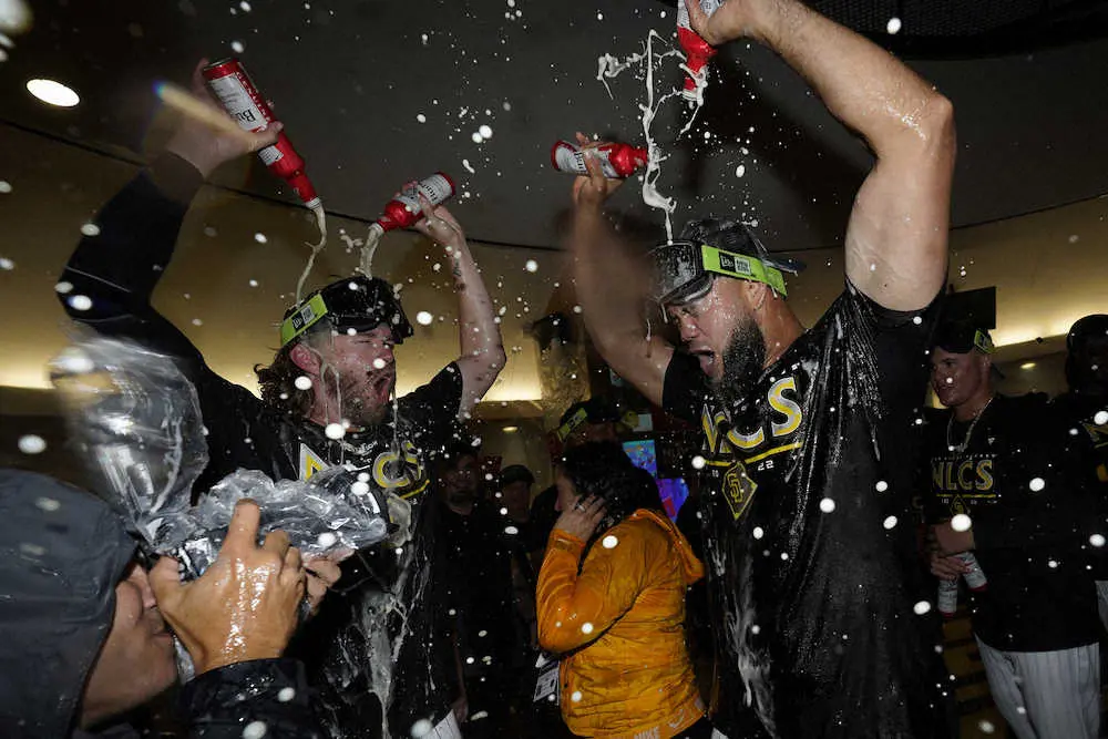 24年ぶりのナ・リーグ優勝決定シリーズ(NLCS)進出を決め、試合後・シャンパンファイトするパドレス・ガルシアら(AP)