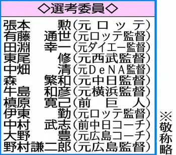 中村武志氏はリーグ連覇したヤクルトのマクガフ―中村に投票。「狭い神宮で年間を通して安定した投球を見せた。中村の貢献も大きいし、セ・リーグ屈指の捕手になった」とした。中村氏と同じ捕手出身の田淵幸一氏は「セ・パ各球団を見ても、柱となる扇の要、正捕手がなかなかいないのは寂しい」と12球団の捕手にさらなる奮起を求めていた。