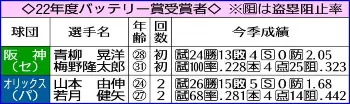 スポーツニッポン新聞社が制定する「2022年度プロ野球最優秀バッテリー賞 powered by DAZN」の選考委員会は18日、パ・リーグは山本由伸投手(24)―若月健矢捕手(27)、セ・リーグは青柳晃洋投手(28)―梅野隆太郎捕手(31)を選んだと発表した。オリックスの山本―若月のバッテリーは2年連続2度目、阪神バッテリーの受賞は17年ぶり3度目。4選手には賞金100万円が贈られる。