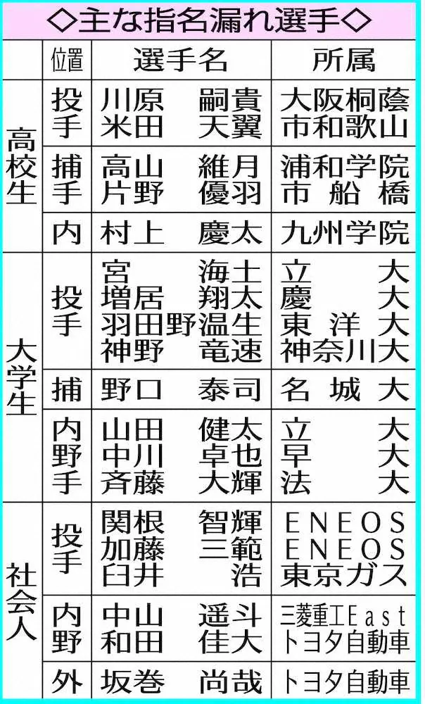 立大・山田 Photo by スポニチ 立大・山田ら名前呼ばれず ヤクルト・村上の弟・慶太は進学へ ギャラリーで見る この記事のフォト 2022年10月21日の画像一覧 もっと見る 2022年10月21日の画像をもっと見る