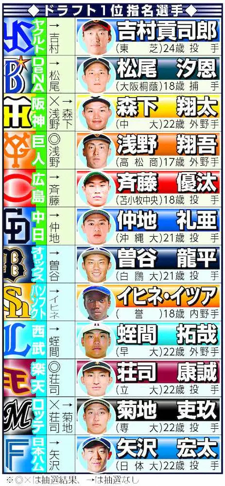 事前に9球団が公表する異例のドラフトでもあった。結果的にこの9球団は公表通りの選手の指名権獲得に成功した。公表しなかったロッテは、楽天との競合で立大・荘司を逃したが、大学日本代表にも選ばれた右腕・菊地を外れ1位で指名。2位以下は内野手を2人、投手2人とバランス良く指名した。