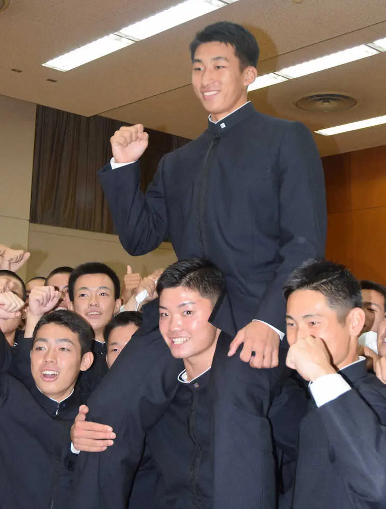 チームメートに肩車される帝京長岡・茨木