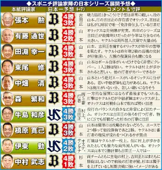 2年連続で同じ顔合わせとなった日本シリーズ。1点差試合が5試合だった昨年に続き、「激闘再び」となるのか――。スポニチ評論家陣が勝負の行方を占い、10人のうち8人がオリックスの日本一を予想。絶対エース・山本の存在が、昨年のリベンジを果たして悲願達成への近道になるとの声が多数を占めた。