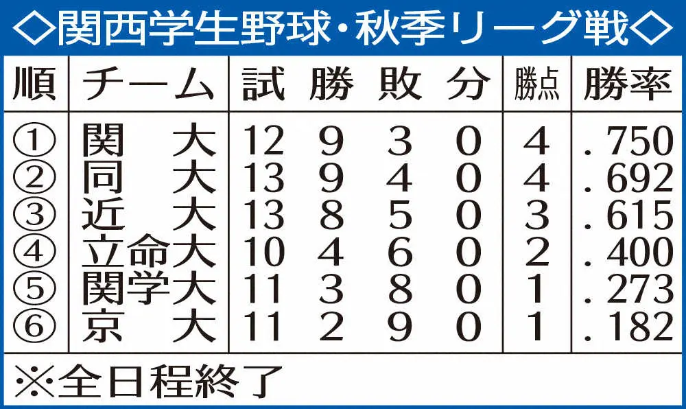 <関大・関学大>2季ぶり39度目の優勝を決め歓喜の輪を作る関大ナイン(撮影・須田麻祐子) Photo by スポニチ 関大2季ぶりV MVP金丸 神宮懸けさあ関西選手権「最少失点に抑えてチーム… ギャラリーで見る この記事のフォト 2022年10月24日の画像一覧 もっと見る 2022年10月24日の画像をもっと見る