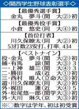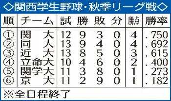関大が関学大に連勝し、2季ぶり(20年春は中止。旧リーグ含む)39度目のリーグ優勝を飾った。明治神宮大会出場をかけて関西地区大学野球選手権(29日~11月1日・南港中央)に出場。全日程を終え、表彰選手も発表された。