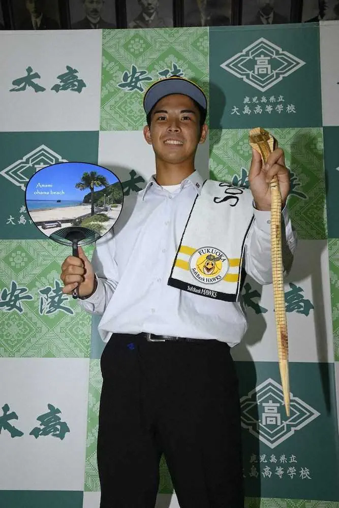 ◇大野 稼頭央(おおの・かずお)2004年(平16)8月6日生まれ、鹿児島県奄美大島の龍郷(たつごう)町出身の18歳。「稼頭央」は父がファンだった西武監督の松井稼頭央氏が由来。小3で龍郷野球スポーツ少年団で野球を始める。中学では龍南中の軟式野球部に所属。高校では2年春から背番号1。甲子園は3年時の今春選抜に出場し、1回戦で明秀学園日立に敗退。今秋のドラフト会議でソフトバンクが4位指名。入団すれば奄美大島の高校出身者では初のプロ野球選手。1メートル75、65キロ。左投げ左打ち。同島出身では昨秋ドラフトでも楽天4位で泰勝利(たい・かつとし=神村学園)が指名されている。