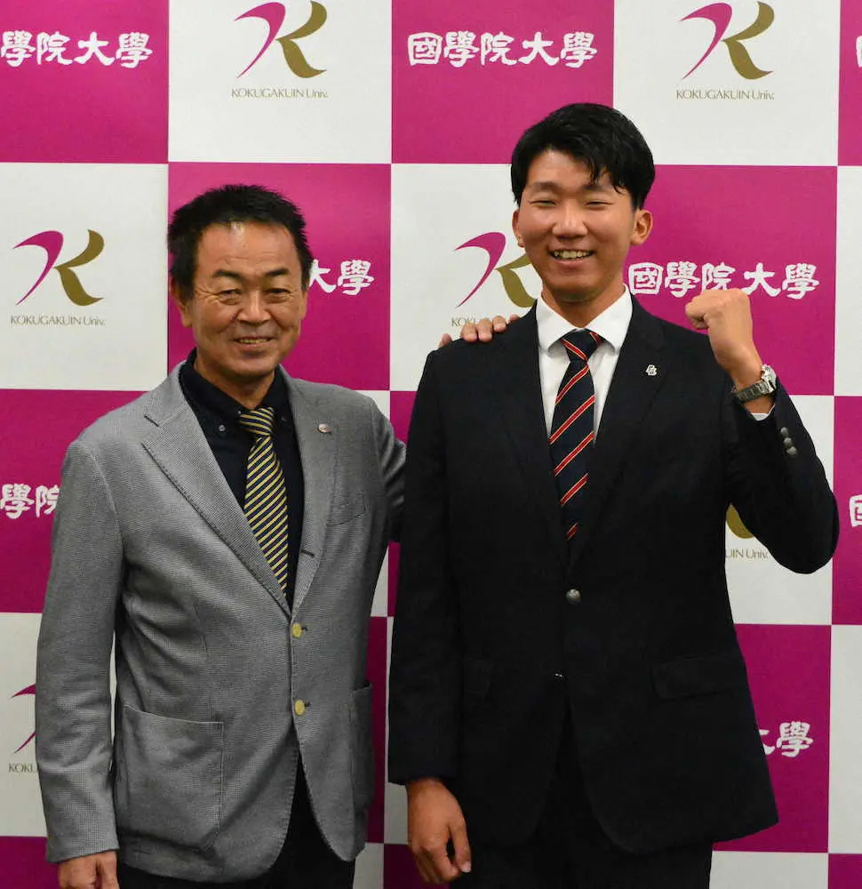 巨人からドラフト3位指名を受けた国学院大・田中千晴投手が、神奈川県横浜市の同大キャンパスで水野雄仁スカウト部長らから指名あいさつを受けた。「真っすぐとフォークで三振が取れるのは自分のアピールポイントだと思います。1年目から先発ローテーションに入って、新人王を取れるように、1軍で活躍できるように頑張りたいと思います」と意欲を見せた。