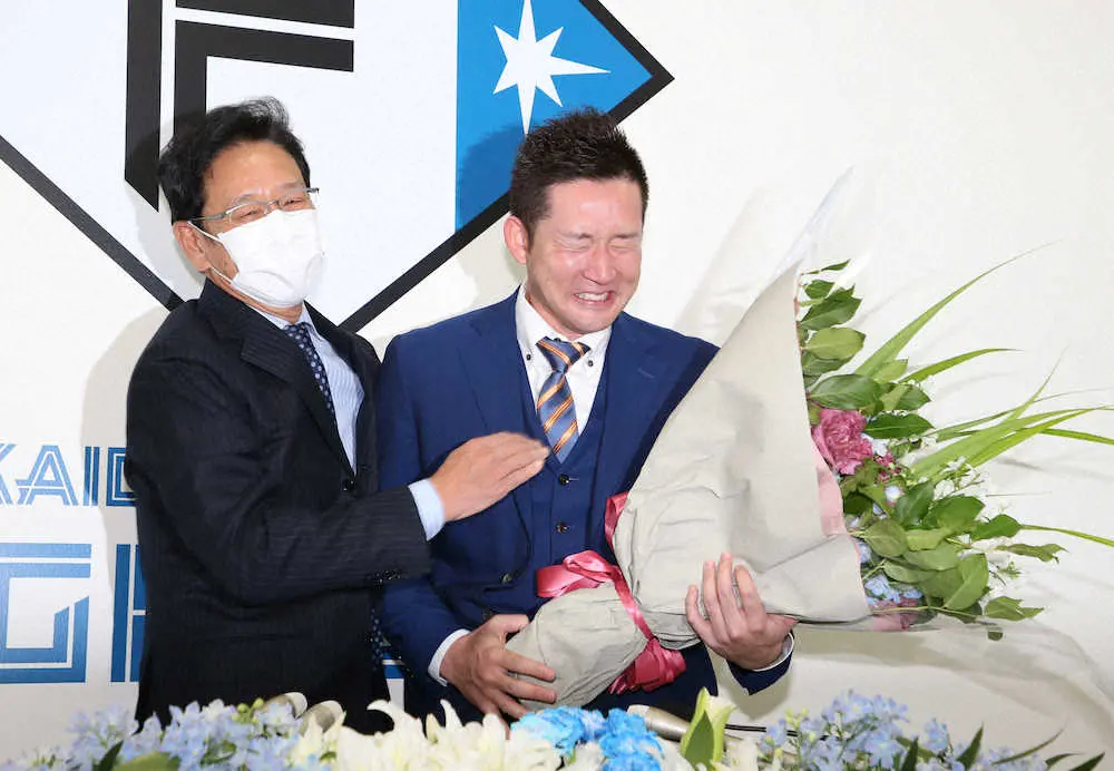 侍ジャパン・栗山監督から贈られた花束を手に涙する日本ハム・杉谷(撮影・高橋茂夫)