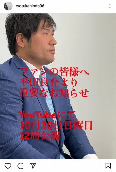平田はスーツ姿の自身の画像とともに、「ファンの皆様へ 平田良介より 重要なお知らせ YouTubeにて 10月30日日曜日 12時公開」と予告。「ファンのみなさまには感謝しかありません。あの大歓声は忘れる事ができません」とつづった。