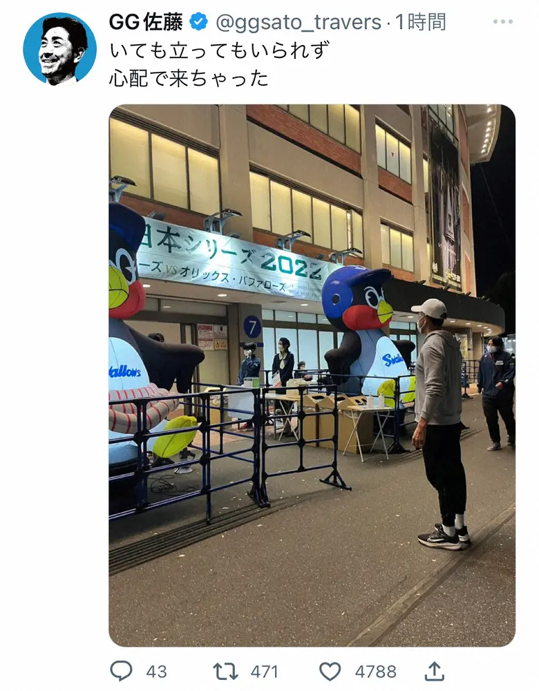 試合中には「いても立ってもいられず心配で来ちゃった」と神宮球場の外でたたずむ姿をアップ。8回にヤクルトが1点差に迫る白熱した試合展開に「日本シリーズ、見どころのボリューム多すぎ!ラーメン二郎、全マシマシかよ!」と記していた。