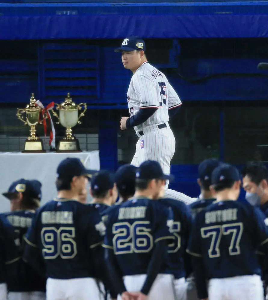 試合終了後、マウンドでオリックスの胴上げが行われる様子をベンチから最後まで見届けた。村上は「多くの方々に、たくさん期待されたにもかかわらず、期待に応えられなかったです」と悔しさをにじませるも、最後には「更に努力していきたいと思います。1年間応援ありがとうございました」と来シーズンのさらなる飛躍を誓った。