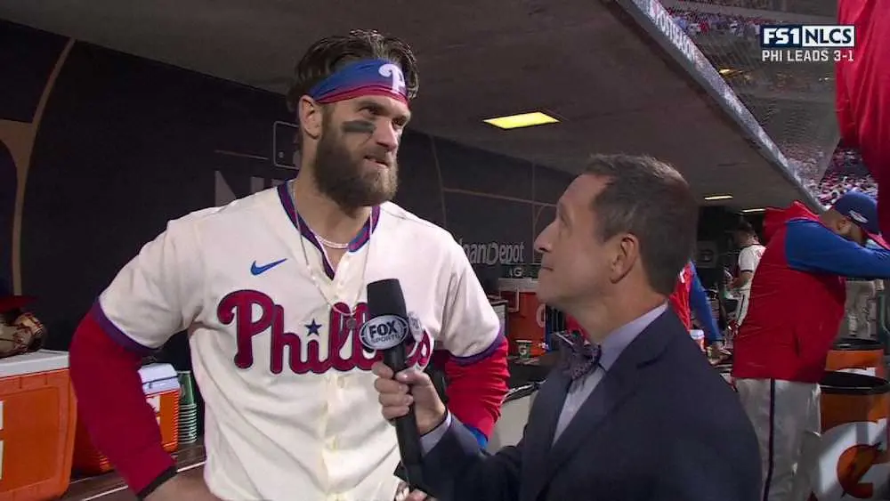 反響が大きかったのはナ・リーグ優勝決定シリーズ第5戦、ハーパーの劇的な逆転本塁打。球場もダッグアウトも大騒ぎの中、45秒のインタビューを取った。「心掛けているのは素早くやること。質問は1つか2つ。自分の興味ではなく、視聴者が何を聞きたいかを考える」。インタビューを受け、ラジオやSNSで言葉が即拡散される。「ここまで反応は良い」とうなずいた。(奥田 秀樹通信員)