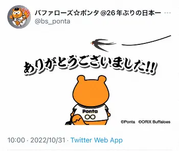 バファローズ☆ポンタツイッター(@bs_ponta)から Photo by スポニチ 「バファローズ☆ポンタ」イラストが大反響 飛んでいくツバメに脱帽 「素… ギャラリーで見る この記事のフォト 2022年10月31日の画像一覧 もっと見る 2022年10月31日の画像をもっと見る