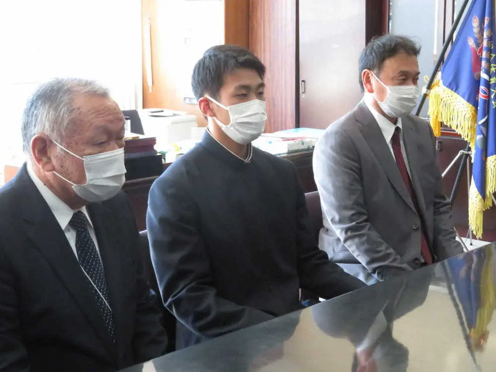 阪神からドラフト4位で指名された帝京長岡高・茨木秀俊投手(中)と元日本ハムで現帝京長岡監督の芝草宇宙監督(右)