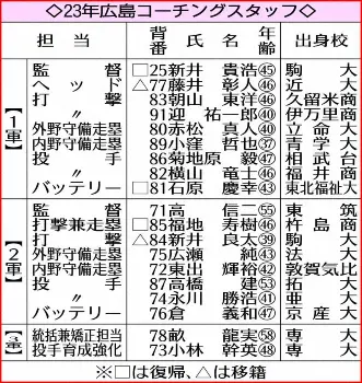 ◆スタッフ発表 広島は31日、来季のコーチングスタッフを発表。赤松真人2軍外野守備走塁コーチ(40)と菊地原毅2軍投手コーチ(47)が1軍担当、高橋建投手コーチ(53)が2軍担当、東出輝裕野手総合コーチ(42)が2軍内野守備走塁に配置転換された。