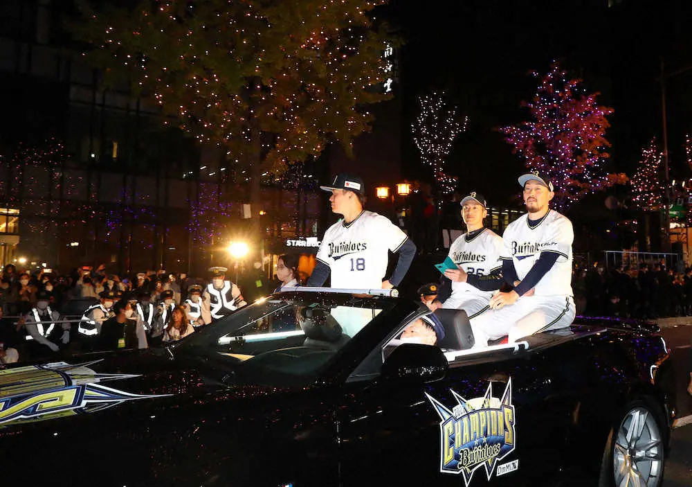 宮内オーナーから始まり、中嶋監督、吉田正、山本の順で最後にマイクを受け取ると、「この日のためにダイエットしてきました。ここを歩くために、シェイプアップしたんです」とジョーク。客席の反応がイマイチと判断したのか、突如、「ありがとうございました!」と自ら打ち切る“剛腕”を披露し、沿道のファンを笑わせた。