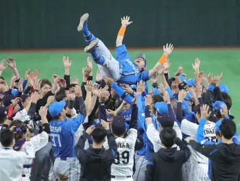 7回無死一塁、阿部の代打で登場すると、東京ドームのファンから大きな拍手が起きた。侍ジャパン2番手の高橋宏斗投手(中日)に対し、4球目の149キロ直球をとらえたが、右飛に終わった。日本ハムのナインに迎えられると涙がこぼれる。新庄監督にも抱きしめられた。試合後には日本ハム、侍ジャパンの両軍の選手に胴上げしてもらい、新庄監督、栗山監督が見守る中、5度宙を舞った。
