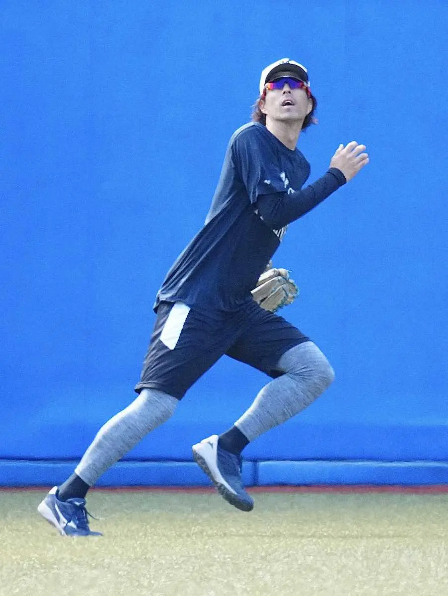 打撃練習中、センターのポジションでボールを追う岡(撮影・長久保 豊)