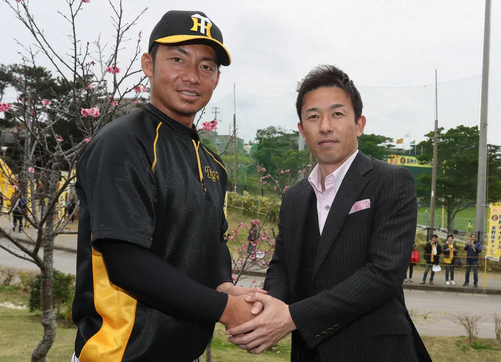 2018年の阪神・宜野座キャンプで、赤星氏(右)の訪問にリラックスした笑顔の鳥谷