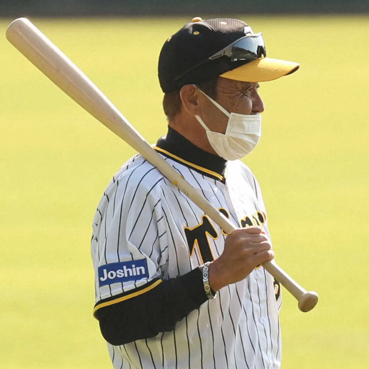 バットを手に練習を見つめる岡田監督(撮影・岸 良祐)