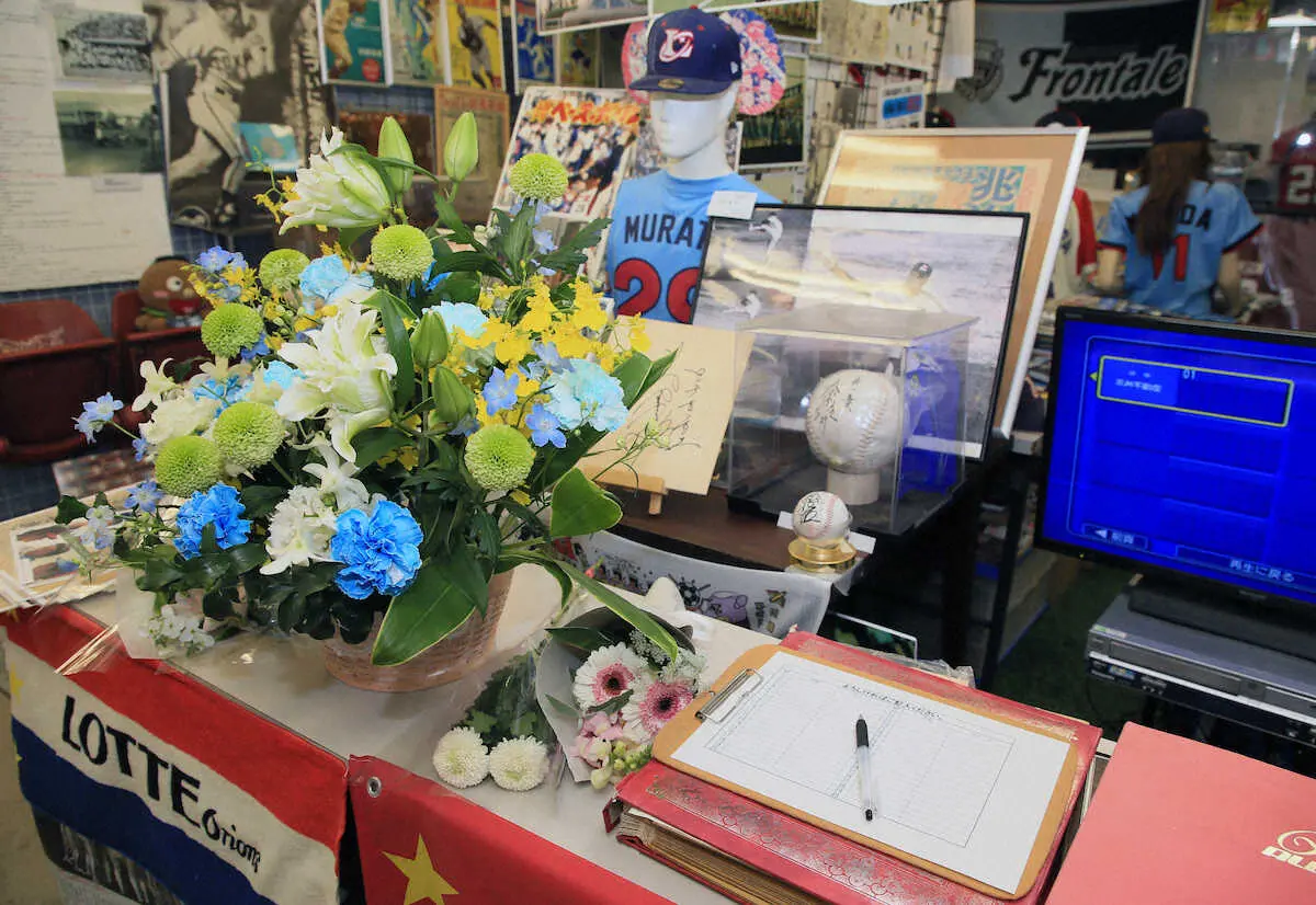 村田兆治さんの「ホーム」元川崎球場で献花台設置 関連グッズ約20点も展示