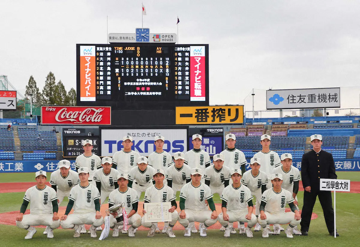 二松学舎大付の打線は10安打と奮闘したが2得点止まり。好機にあと一本が出なかった。1年生の片井海斗は「4番・一塁」で5打数1安打1打点。初回に先制の左前適時打を放ったものの、持ち味の長打力は発揮できず「やるべきことが全然できなかった。まだ未熟」と肩を落とした。来春選抜の関東・東京の一般枠は7。準優勝で選出の可能性を残した市原勝人監督は「どうでしょうかね…夢があることはいいこと」と語った。