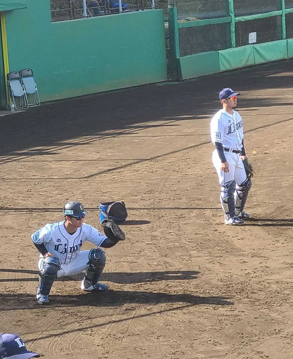 来季、西武の正捕手の座を争う古賀(左)と柘植