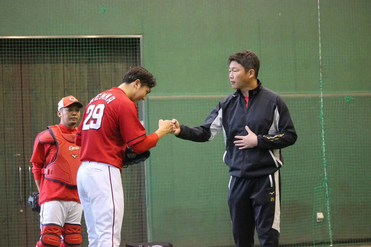 広島・新井監督が秋季キャンプ最終クール2日目の19日、ブルペンで投球練習するケムナを相手に“初打席”に立った。初球の内角直球から至近距離で威力を確認すると、飛躍を誓うパワーアームに定番の金言を授けた。