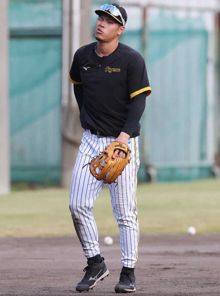 前日途中離脱の阪神・佐藤輝が全体練習に参加 ノックで背中の張り訴えるも、元気に走る姿披露