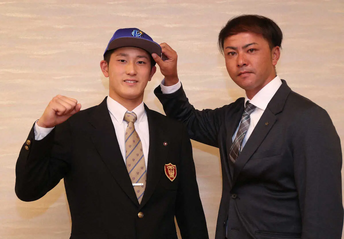 <DeNA新入団選手記者発表会>笑顔の三浦監督(左)と松尾(撮影・島崎忠彦) Photo by スポニチ DeNA入団選手記者発表会 ドラ1松尾は「ハマの侍」へ ギャラリーで見る この記事のフォト 2022年11月27日の画像一覧 もっと見る 2022年11月27日の画像をもっと見る