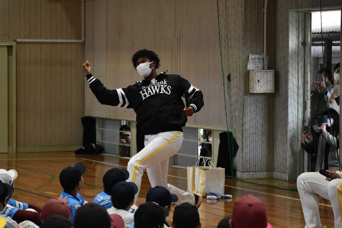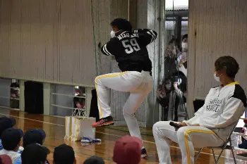 23日、山口県周南市の体育館で行われた野球教室。野球少年少女の前で師匠のものまねを豪快に披露した水谷だが、心には迷いがあった。入団1年目オフから自主トレに参加している松田からの事前連絡で、今冬も宮崎での“熱男塾”の頭数に入れてもらった。ただ、来季5年目。自身の勝負の年とみて返事を熟考している。