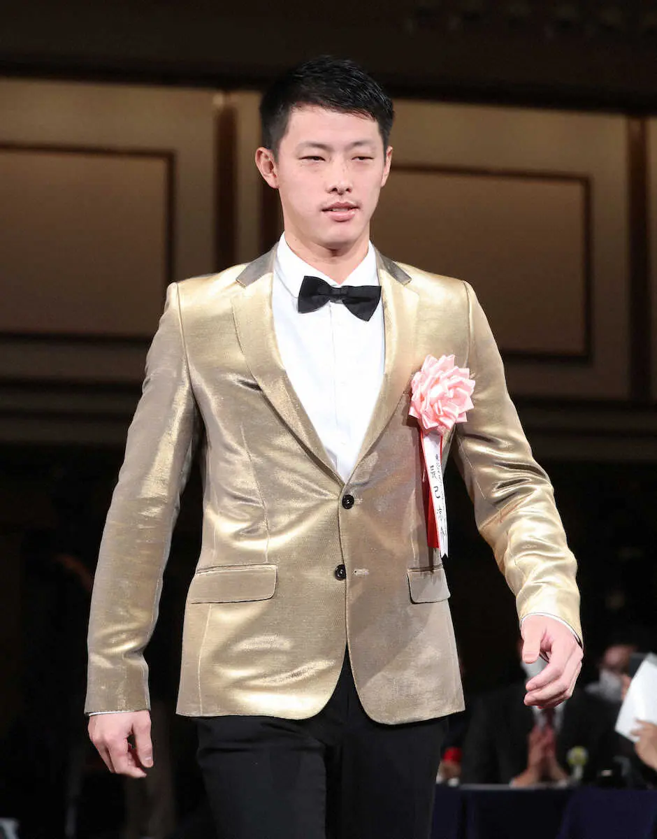 外野手で2年連続2度目の受賞となった楽天・辰己は、ゴールデンに合わせてド派手な金色のジャケットで登場。白いシャツと黒の蝶ネクタイで、受賞者の中でもひときわ目立っていた。