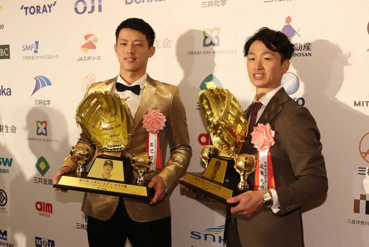 守備のベストナインに贈られる「第51回三井ゴールデン・グラブ賞」の表彰式が29日、都内のホテルで行われ、記者投票で選ばれたセ、パ18選手にグラブ形のトロフィーと賞金50万円が贈呈された。2年連続2度目の受賞の楽天・辰己涼介外野手(25)は、ド派手な金色のジャケット姿で来年以降も連続受賞を目指すことを誓った。コロナ下でここ2年は一部選手のみの参加だったが、3年ぶりに受賞全選手が出席した。