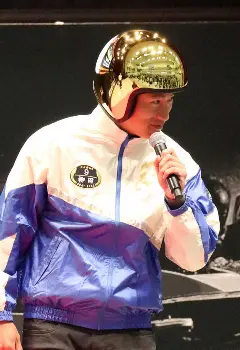 下関競艇場でのトークショーで黄金のヘルメットをかぶり挨拶する柳田(撮影・中村 達也)