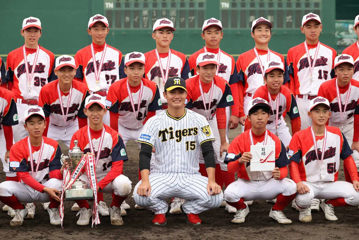 <タイガースカップ表彰式>タイガースカップ優勝を決めたヤング湊クラブの選手達と記念写真に収まる西純(中央)(撮影・後藤 正志)