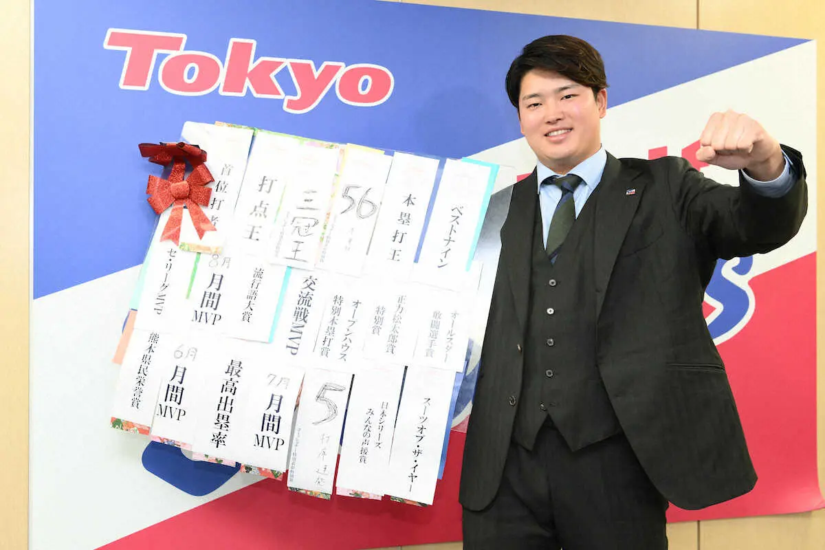 日本選手最多56本塁打を放って史上最年少3冠王に輝き、リーグ連覇に貢献した4番に対し、球団は異例の条項も付け加えた。現行の「25歳ルール」やポスティングのルールなどに変更があり、大型契約を結ぶことが可能であれば、2年後の24年オフにもポスティング移籍を容認するという。村上は「球団には感謝しかありません」と頭を下げた。