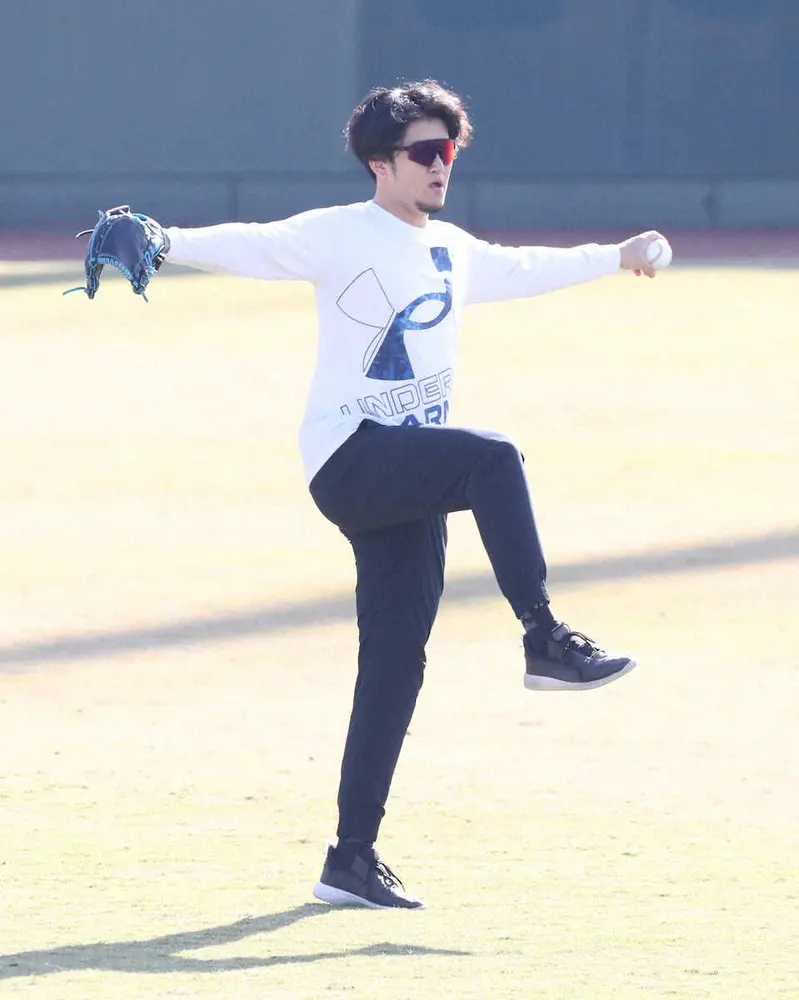 キャッチボールを行う岩貞(撮影・成瀬 徹)