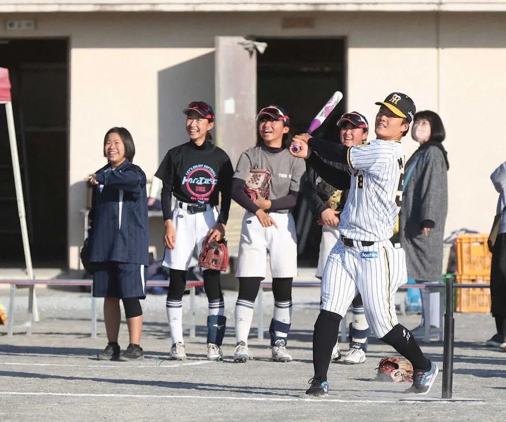 阪神・前川右京外野手(19)が10日、三重県員弁郡の東員第二中で日本プロ野球選手会の野球振興事業「マクドナルド野球・ソフトボール体験会サポートプロジェクト」に参加し、ドラフト1位で加入する森下翔太外野手(22=中大)との右翼争いへ早くも闘志を燃やした。