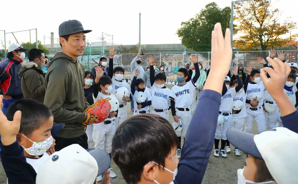 【「夢授業」2年連続サプライズ登場】16年から始まった「岩崎優の夢授業」は今年が7回目で、「佃ホワイトスターズ」の38人が参加した。昨年に続いて岩崎はサプライズで「いきなりやってきました」と登場。子供たちからは「え?ガチ?」「マジ?」「ヤバっ」などと驚きの声が次々に上がった。投手を務めた1打席対決では打ち込まれる場面もあり「レベルが高かった。声も出てるし、いいチームでした」と目を細めた。捕手でボールを受けた4年生の石田典くん(10)は「ボールの伸びが凄かった」と感激していた。