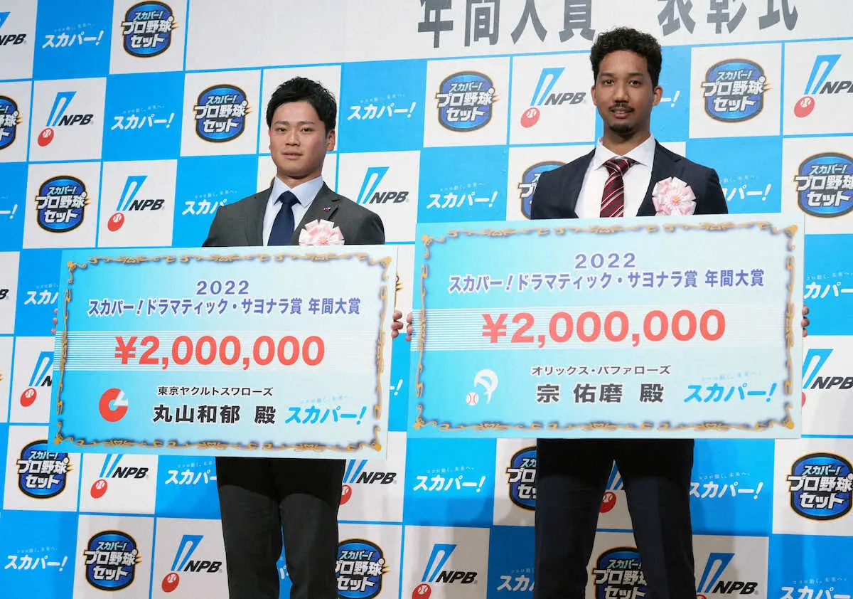 セ、パ両リーグは13日、最も劇的なサヨナラ打を打った打者を選ぶ「スカパー! ドラマティック・サヨナラ賞」の年間大賞に、セはヤクルトの丸山和郁外野手(23)、パはオリックスの宗佑磨内野手(26)を選出し、都内で表彰式が行われた。