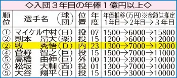 「今知ったんですが凄くうれしい。(1億円は)一つの目標でもあった」。出場全135試合に4番で出場。打率・291、24本塁打、87打点でチームを前年最下位から2位に引き上げた。三浦監督は不調時も「4番は動かさない」と信頼は揺るがず。牧も「打率は1年目より上がらなかったが、本塁打と打点は上がったのは良かった」と振り返った。