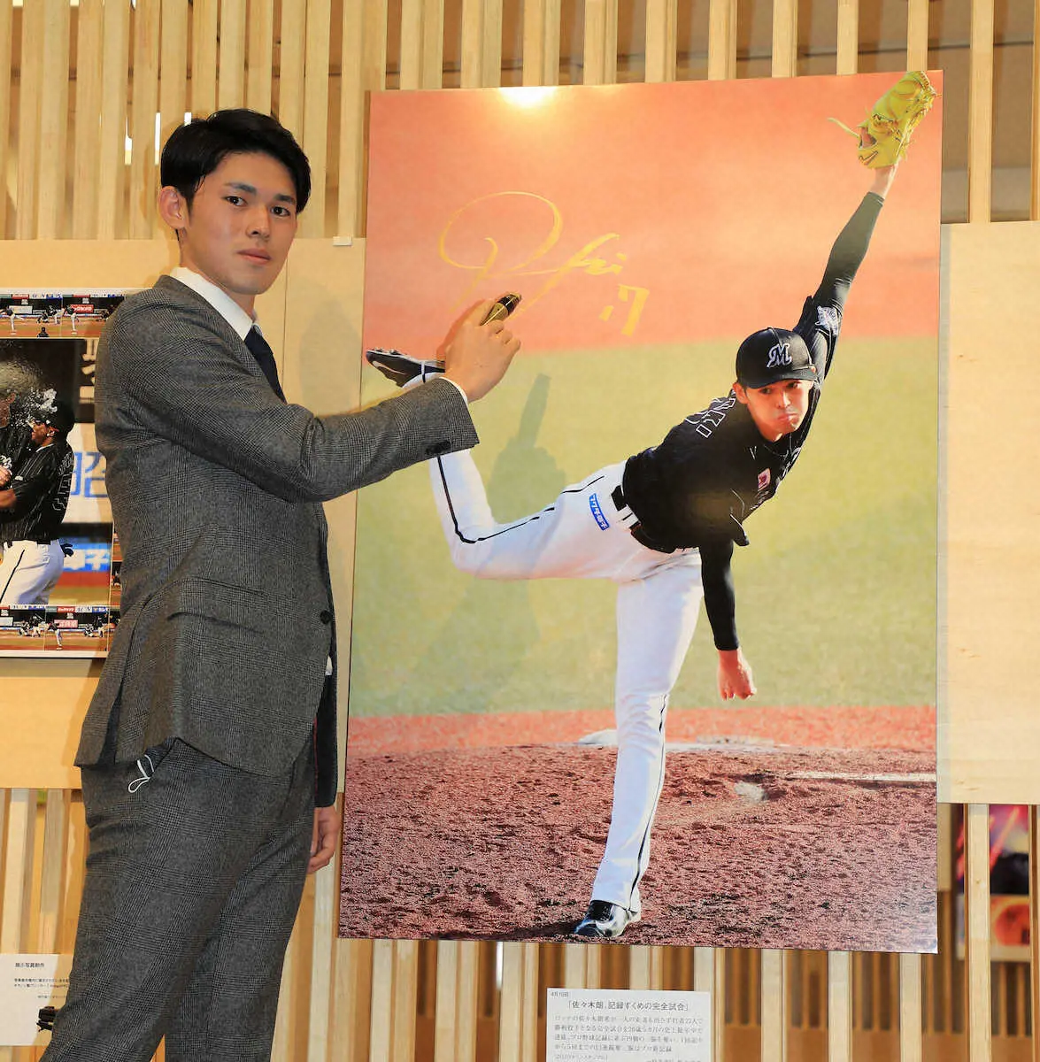 報道カメラマンによるさまざまな写真の中には、自身の快挙を報じられた枚のパネルもあった。それぞれに、直筆のサインを入れ、あらためて写真にも収まった。