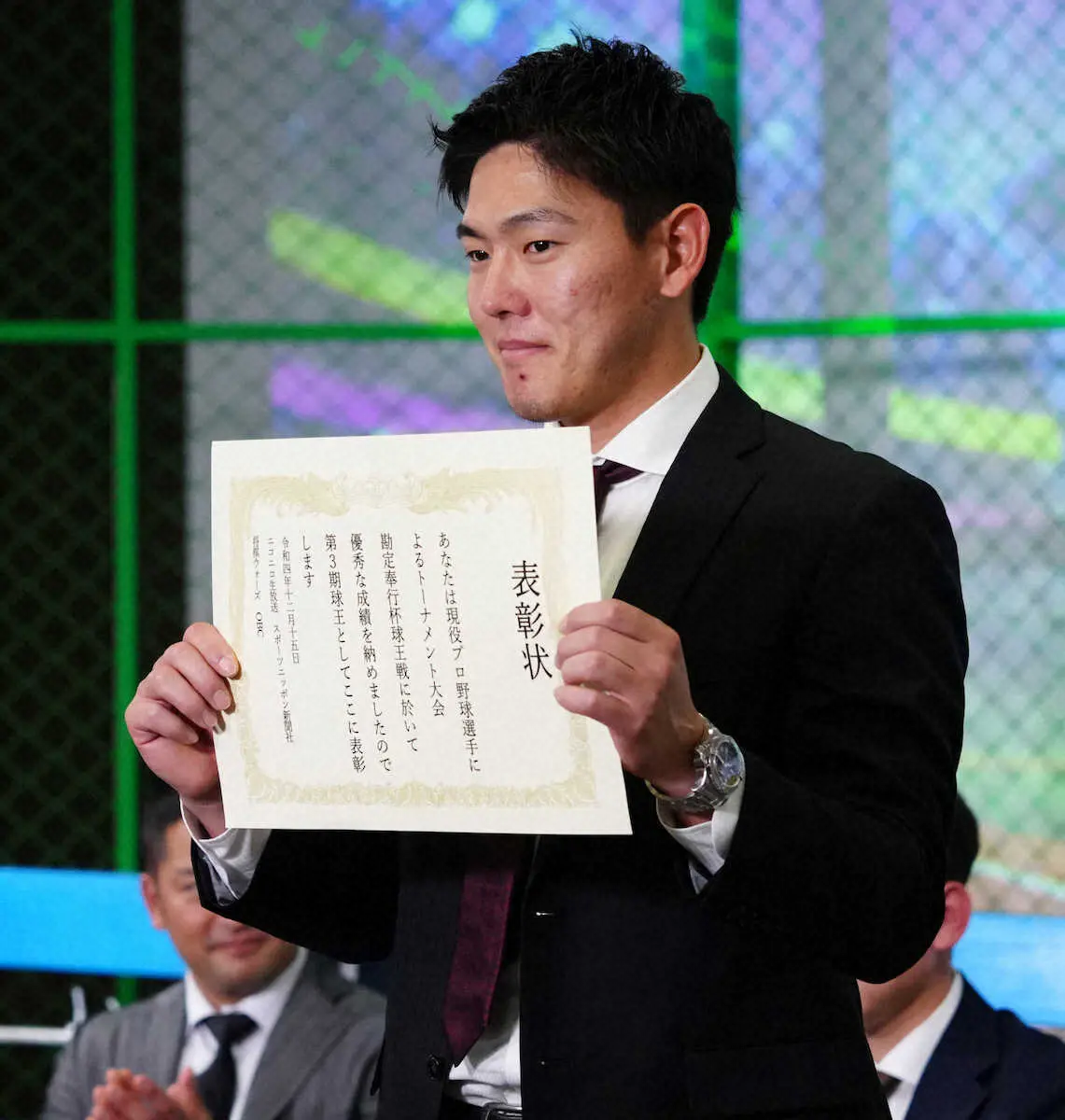 <球王戦、プロ野球最強将棋王決定戦>球王戦を制し表彰状を贈られたロッテ・安田(撮影・島崎忠彦)