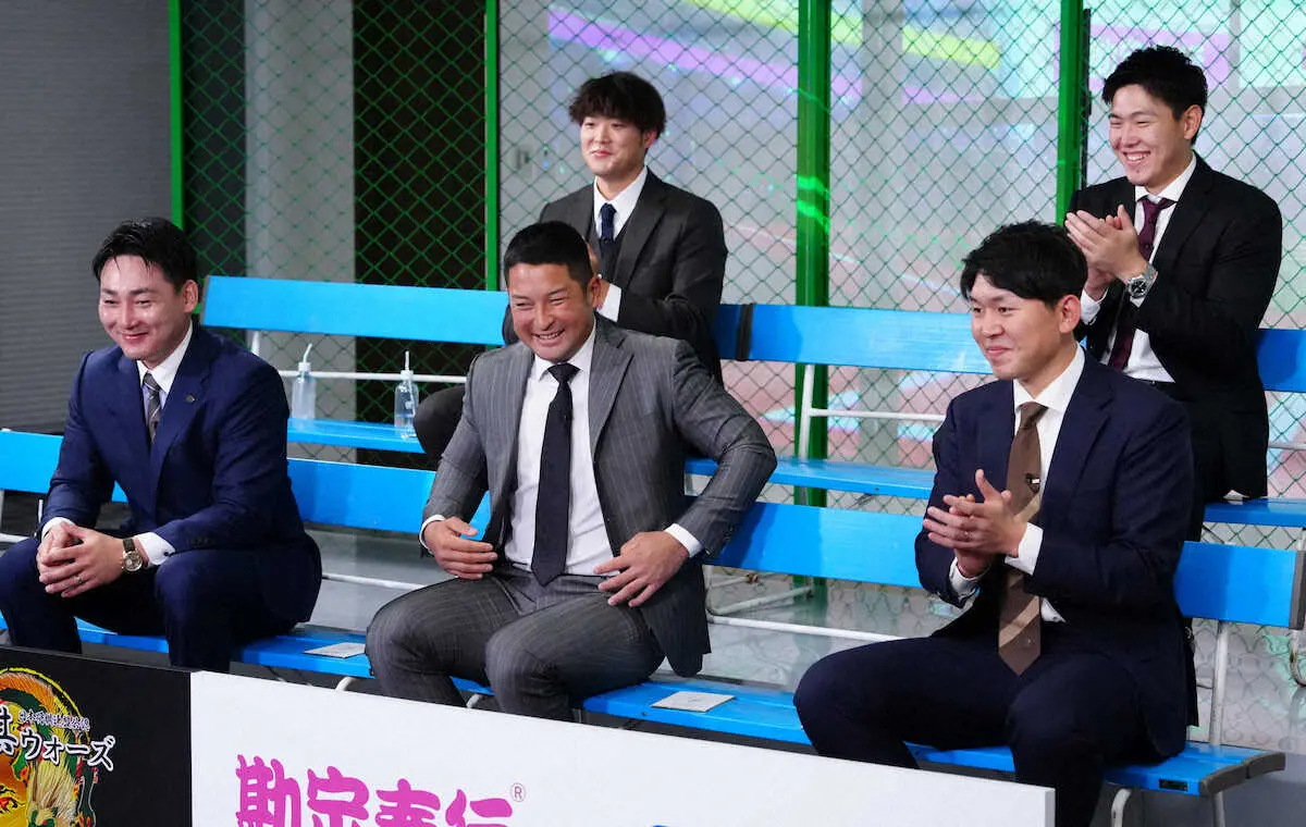 <球王戦、プロ野球最強将棋王決定戦>球王戦に挑む(前列左から)巨人・丸、ソフトバンク・嶺井、楽天・西口、日本ハム・斎藤、ロッテ・安田(撮影・島崎忠彦)