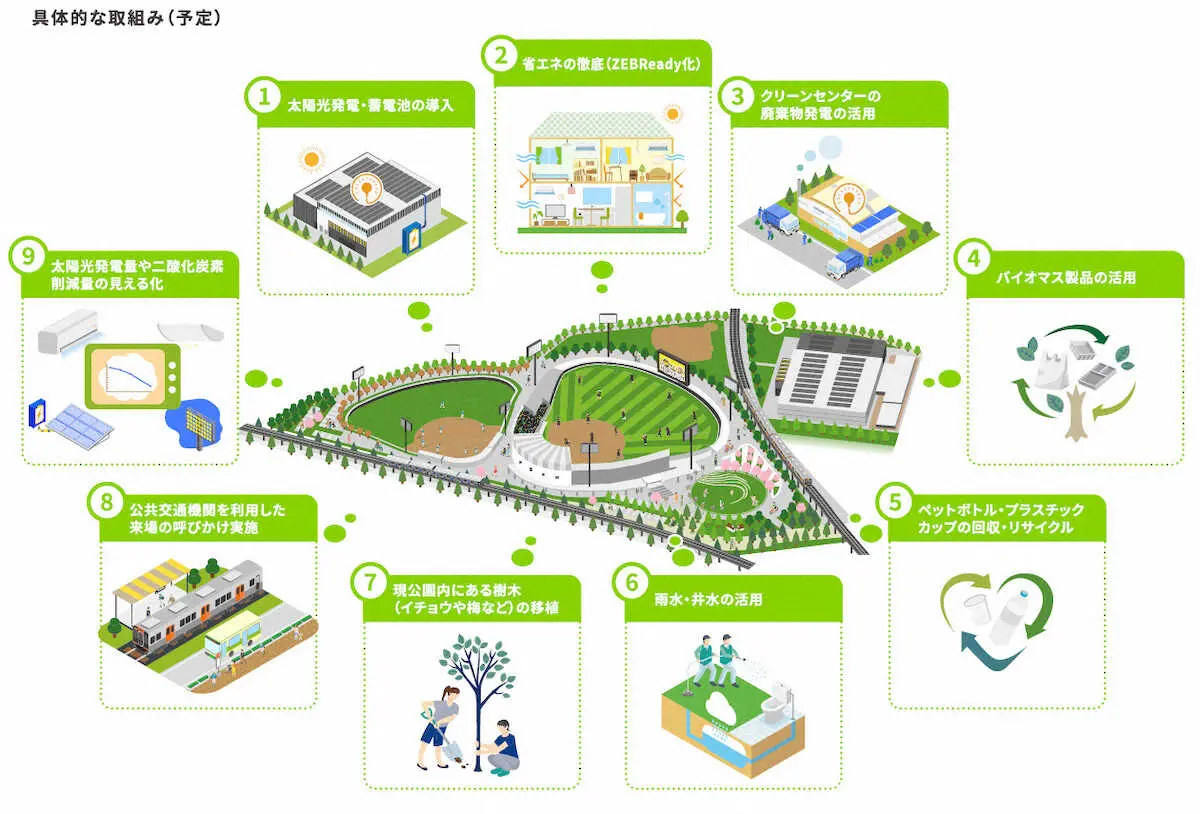 室内練習場や選手寮兼クラブハウスの屋上、野球場のバックスクリーン背面に太陽光パネルを設置して発電。新しい野球場で想定される年間の電力使用量の約80%にあたる年間約73万キロワットを「創エネ」し、備えた蓄電池を活用することで、生み出した電力を自家消費する。また、「省エネ」にも注力。屋根や壁に高性能断熱材、高効率空調機、昼光センサー・調光機能付きLED照明、高効率型モーターによる換気設備などを採用する。「創エネ」と「省エネ」により、年間の二酸化炭素排出削減量1000トン以上を見込む。脱炭素関連の認証取得も目指す。