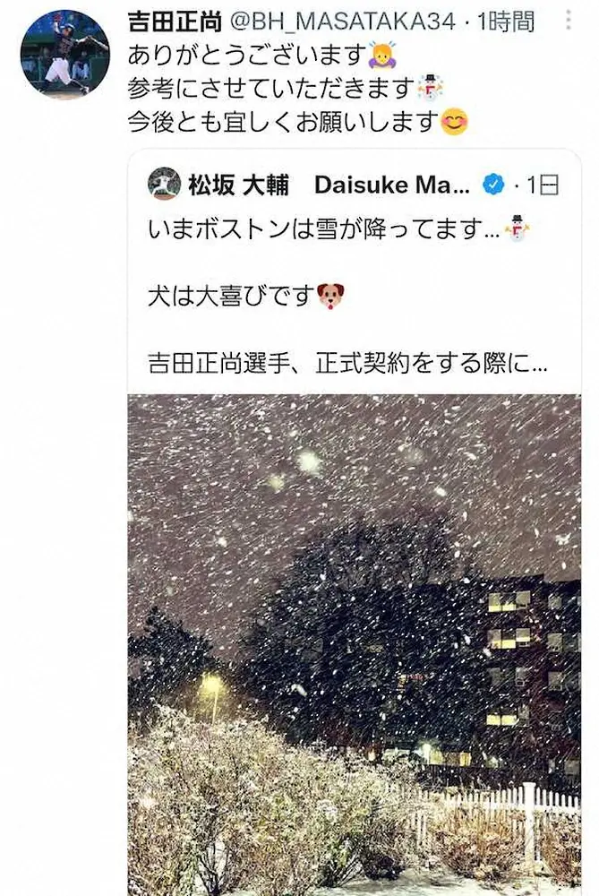 ソフトバンク・柳田、元中日の藤井淳志氏とのオンライントークショーに出演したレッドソックス・吉田 Photo by スポニチ Rソックス加入の吉田正 ボストンから第一声「大谷君楽しみ」屋外球場に「… ギャラリーで見る この記事のフォト 2022年12月16日の画像一覧 もっと見る 2022年12月16日の画像をもっと見る