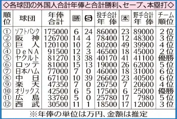 日本シリーズを戦ったセ、パ両雄の外国人は年俸、成績ともに対照的だった。ヤクルトの助っ人勢は12球団中5位の総額8億1270万円と高い部類だったが、レギュラーシーズンで投手が合計13勝、38セーブを挙げ、打者が合計41本塁打。外国人が勝利、セーブをそれぞれ合計10以上、一発を30本以上は両リーグを通じてヤクルトだけだ。投打の助っ人がそろって活躍した唯一のチームと言える。